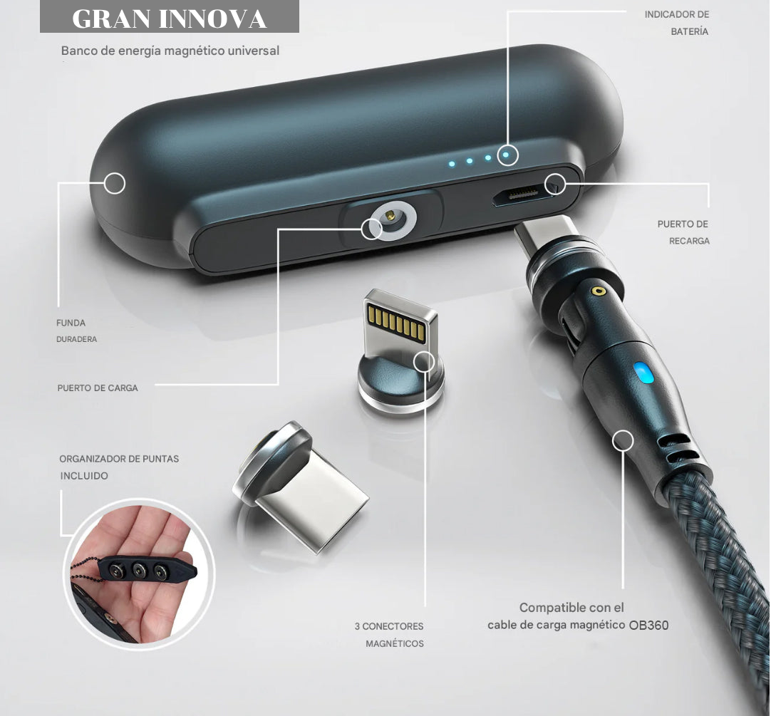 Olvídate de los cables enredados y las baterías agotadas. La Batería Portátil Magnética 3 en 1 es la solución definitiva para mantener todos tus dispositivos cargados en cualquier momento y lugar. Su diseño magnético permite una sujeción firme y segura a tu smartphone, mientras que su sistema 3 en 1 incluye carga inalámbrica, puerto USB-C , Micro USB y apple compatible, cubriendo todas tus necesidades de carga.