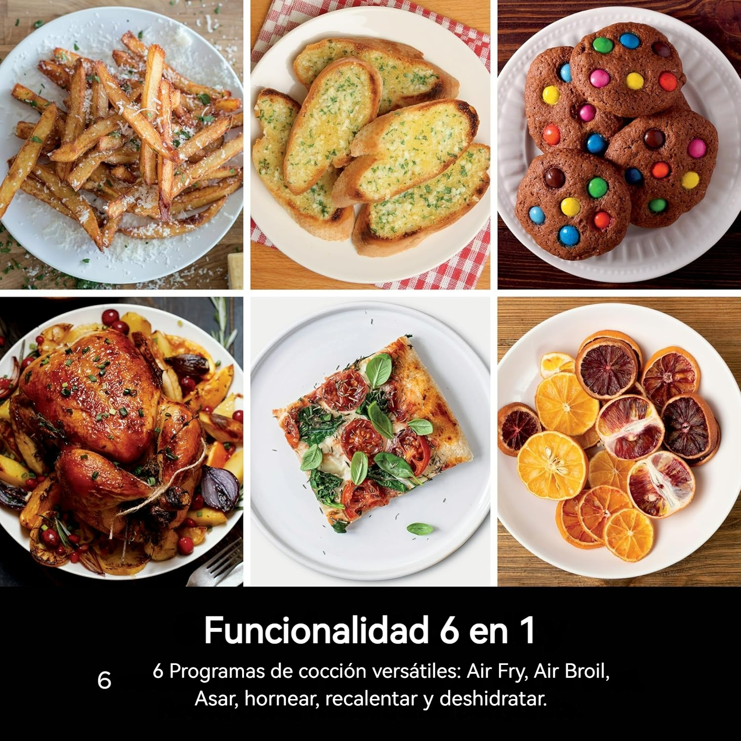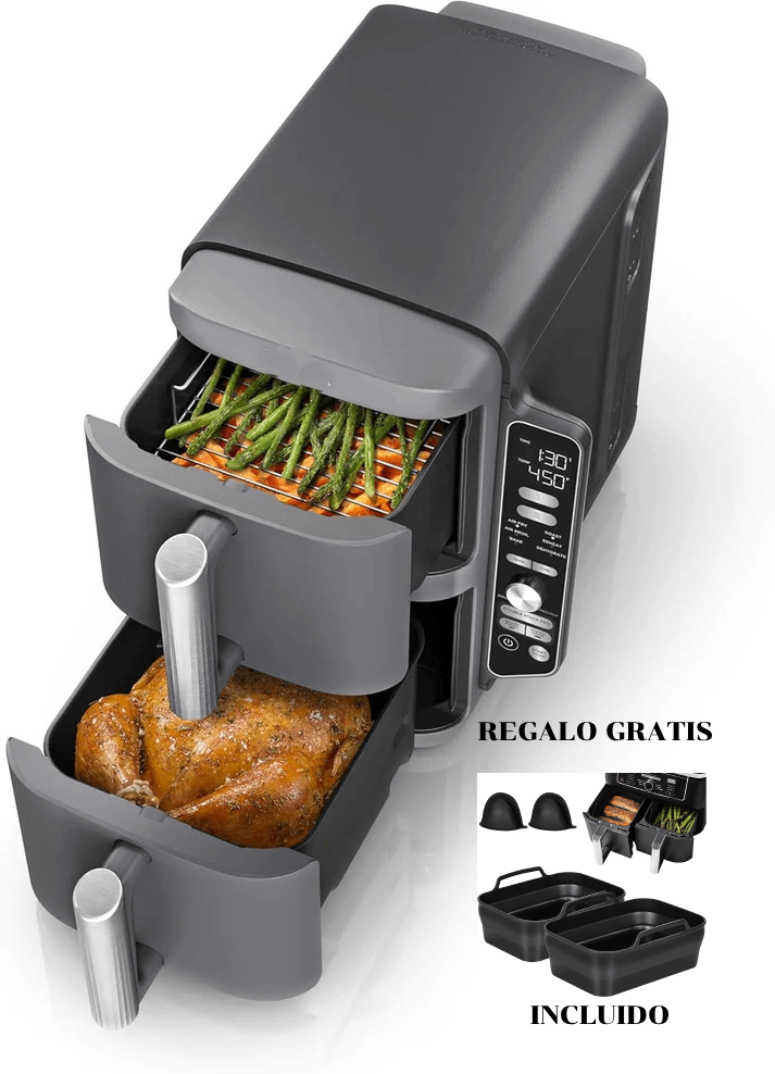 Con espacio para dos pollos de 5 libras, esta freidora alimenta hasta 8 personas sin esfuerzo. Su diseño compacto no sacrifica potencia ni versatilidad, convirtiéndola en el aliado perfecto para cocinas modernas, funcionales y estéticas.