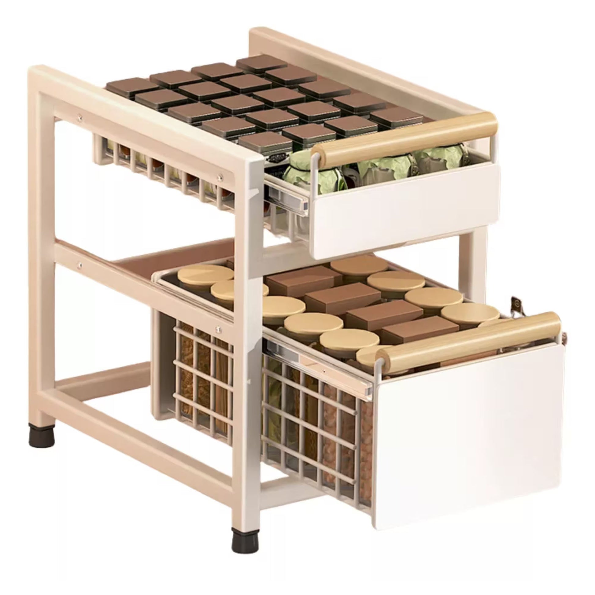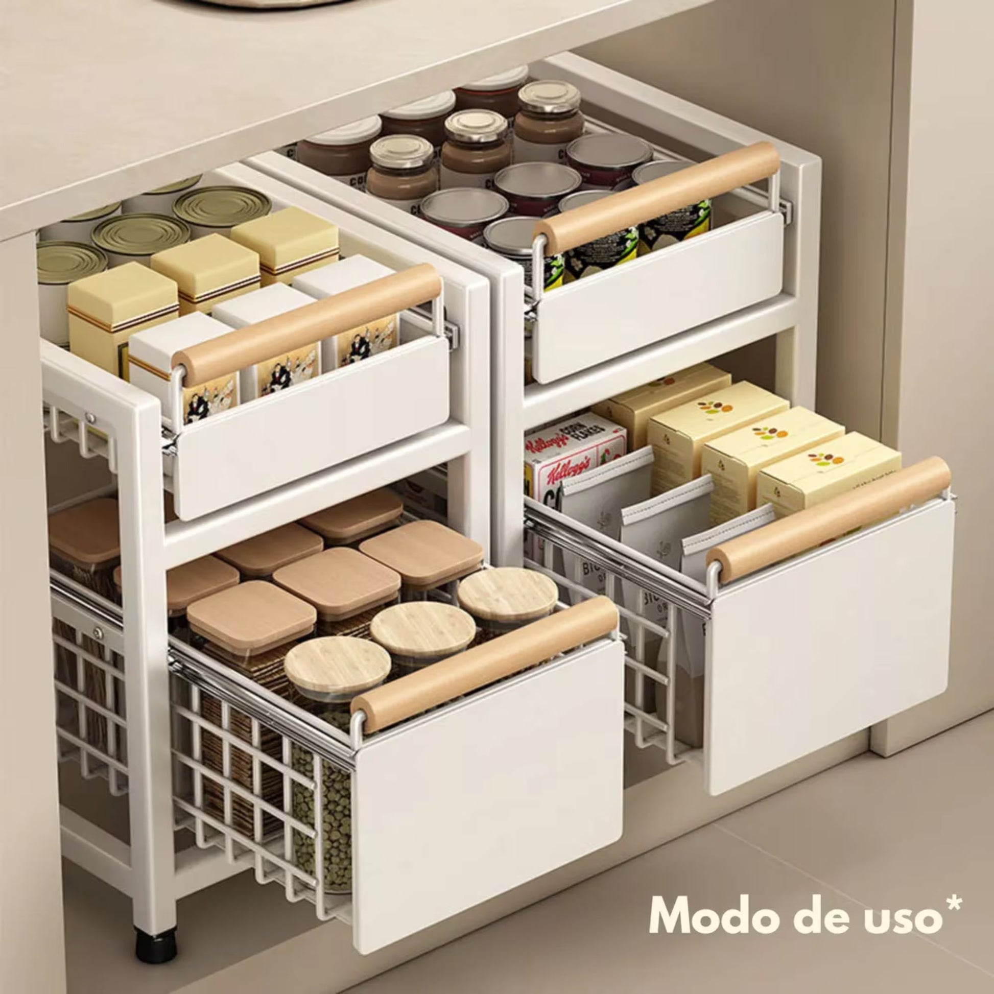 Dos bandejas deslizables que permiten visualizar y acceder fácilmente a lo almacenado. Perfecto para debajo del fregadero, estantes abiertos o muebles de baño.