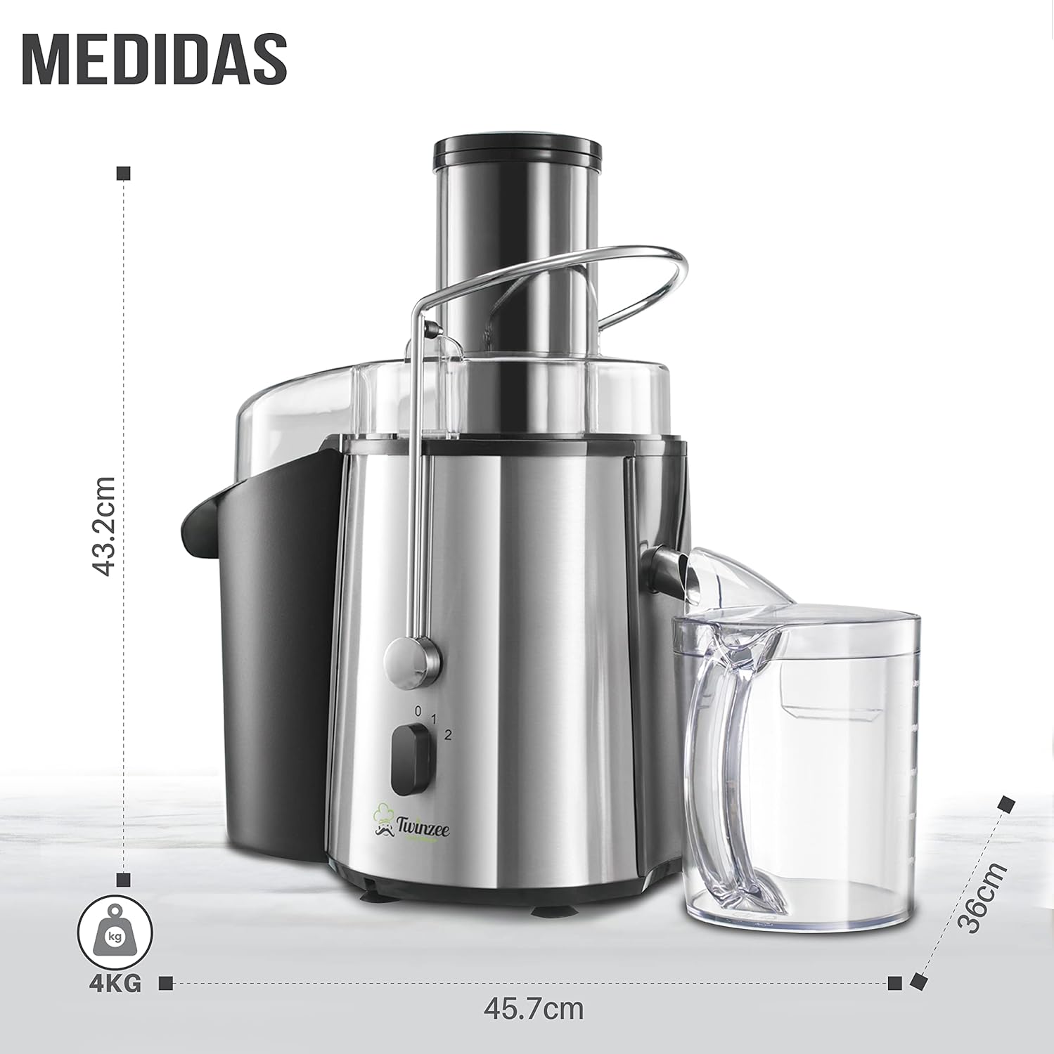 Con su boca ancha de 75 mm, no necesitas cortar las frutas. Incluye recipientes grandes (1 L para zumo, 2 L para pulpa), patas antideslizantes y piezas aptas para lavavajillas. Además, incluye un cepillo de limpieza. ¡Fácil, rápido y limpio!