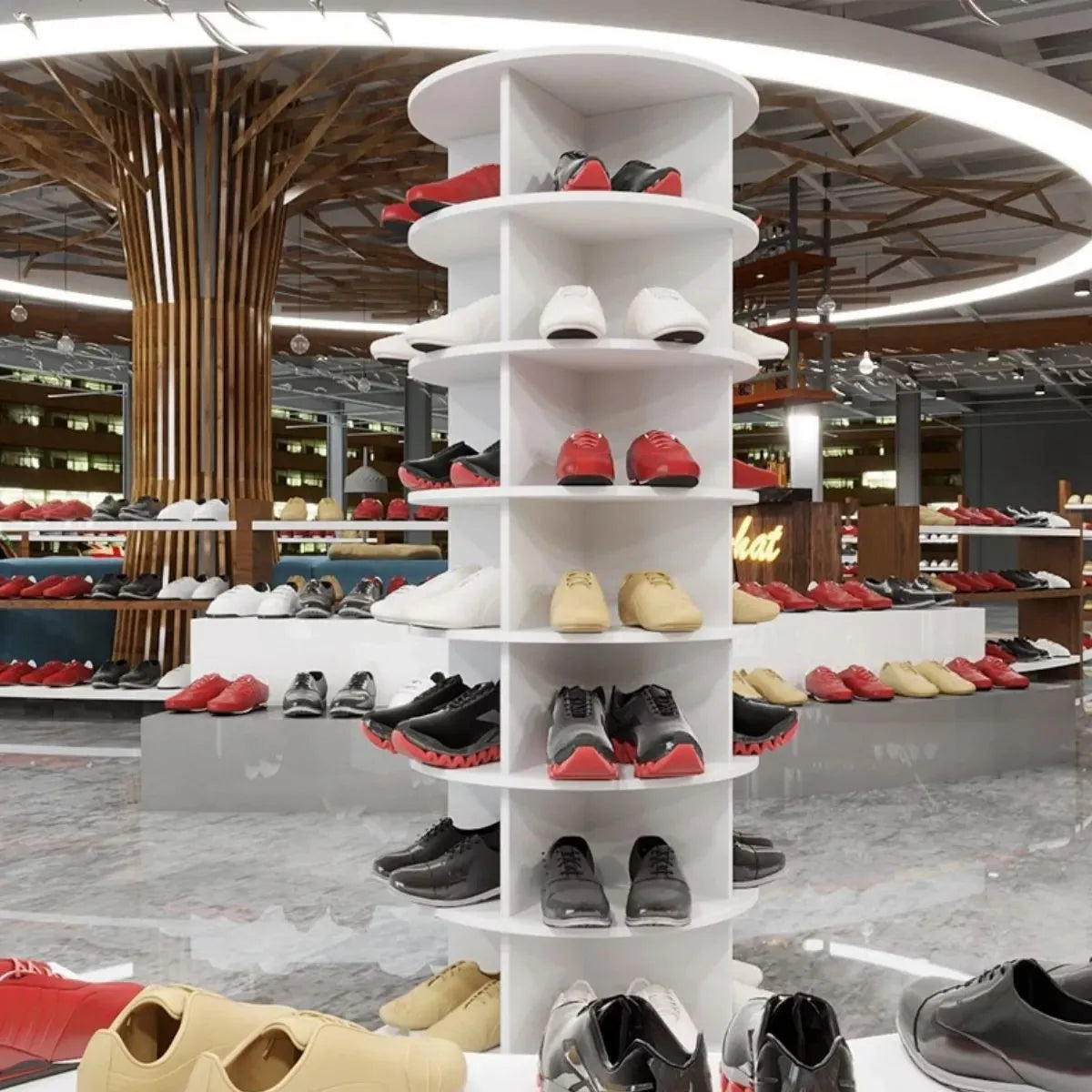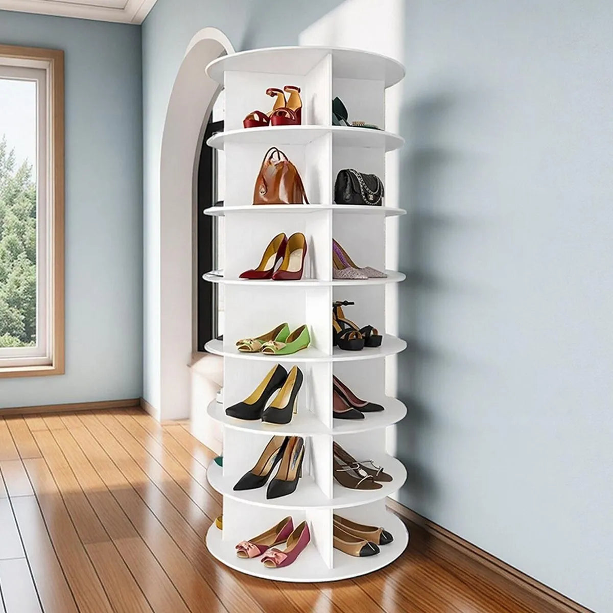 Mueble giratorio de 180 cm de alto, con 8 estantes y capacidad para hasta 32 pares de calzado. Ideal para entradas, vestidores y dormitorios con estilo funcional.
