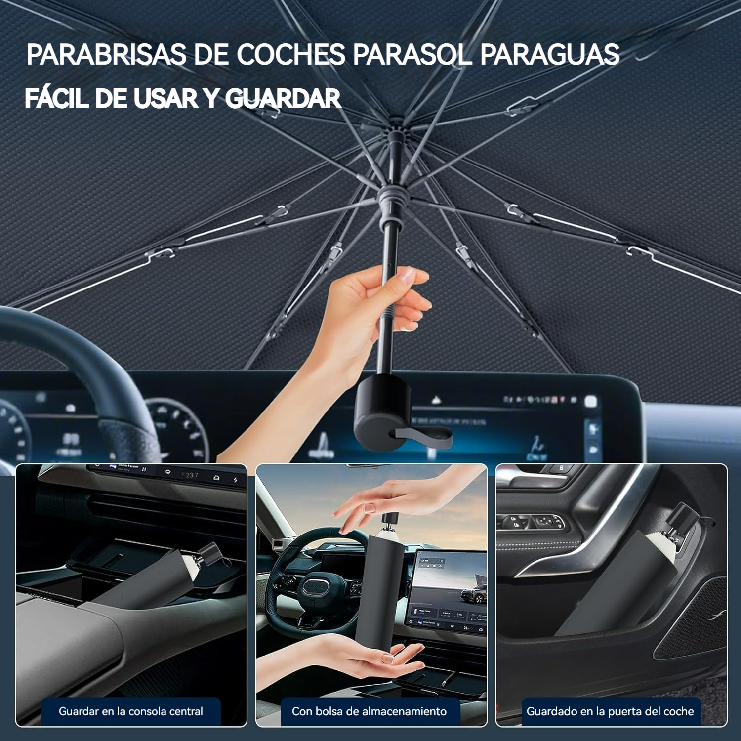 Fabricado con tela recubierta de alta densidad y tecnología de deflexión térmica, este parasol bloquea el 99.9% de los rayos UV, IR y calor intenso. Preserva la temperatura interior del vehículo y protege el tablero, volante y tapizados del desgaste solar.