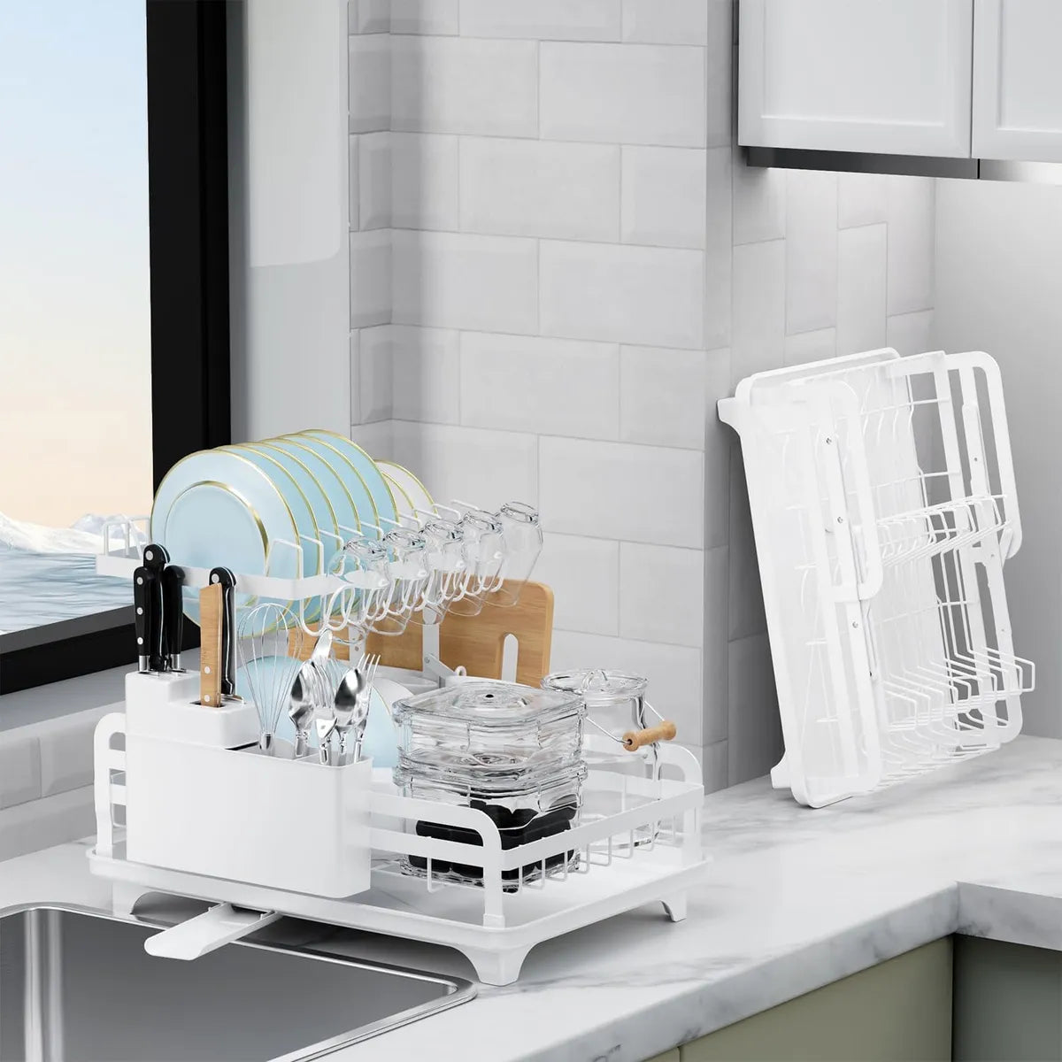 Organizador de cocina con múltiples compartimentos, bandeja de drenaje y soporte para utensilios. Ideal para cocinas pequeñas o espacios compartidos