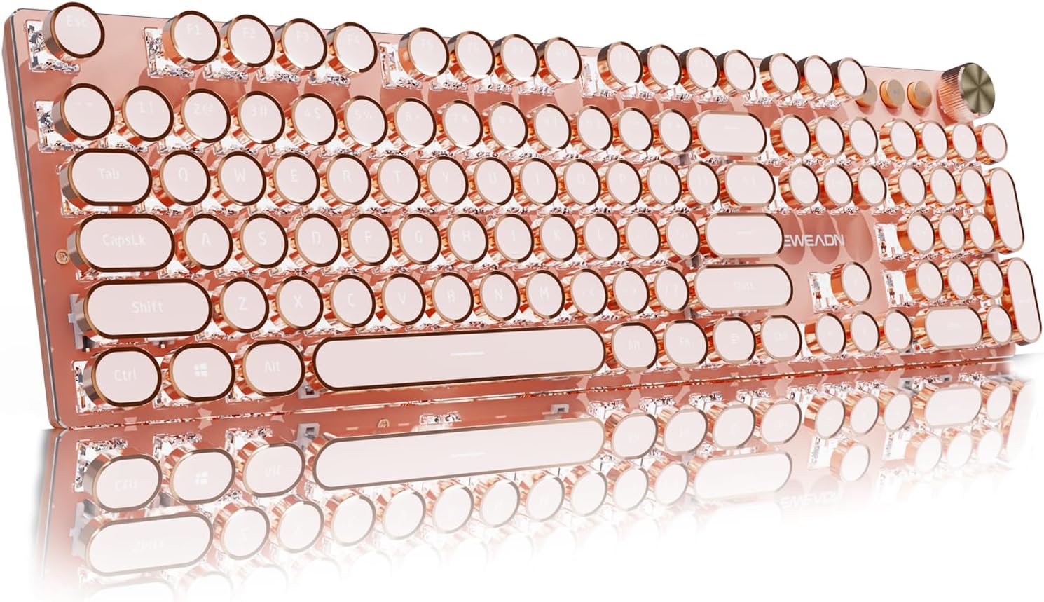 Diseño inspirado en las clásicas máquinas de escribir, con teclas redondas, retroiluminación monocromática y estructura metálica. Ideal para escritorios creativos, setups estéticos o usuarios que valoran el tacto y el diseño.